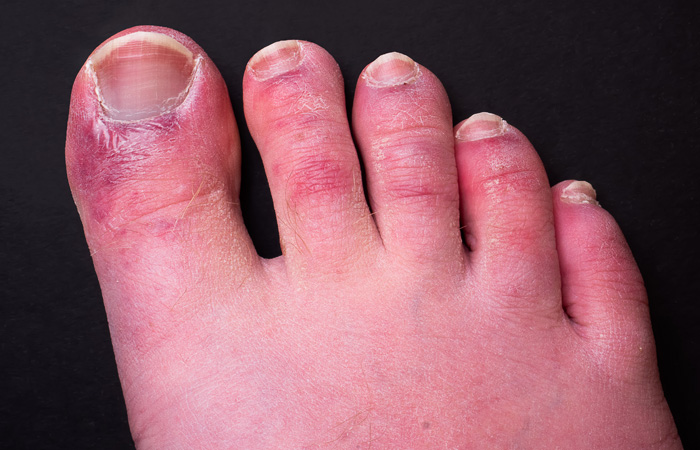 This appears to be a more popular presentation among those with Covid-19 based on 304 published cases. The condition most commonly affects the toes (see picture) but is also seen on the fingers. The condition can be asymptomatic but reported symptoms have included itch and tenderness and sometimes occurs after oedema. These lesions have been commonly reported in children and adolescents who are mildly symptomatic and can develop within days of infection, although the evidence linking these chilblains with Covid-19 is limited.