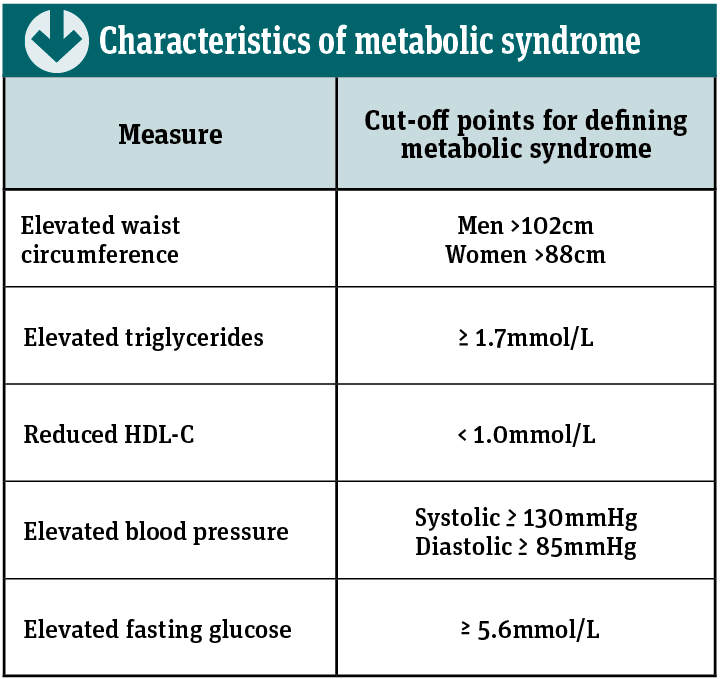 While the criteria used to define metabolic syndrome have evolved over the years, it is currently diagnosed when at least three or more of the factors shown in the table on p24 are present in an individual.