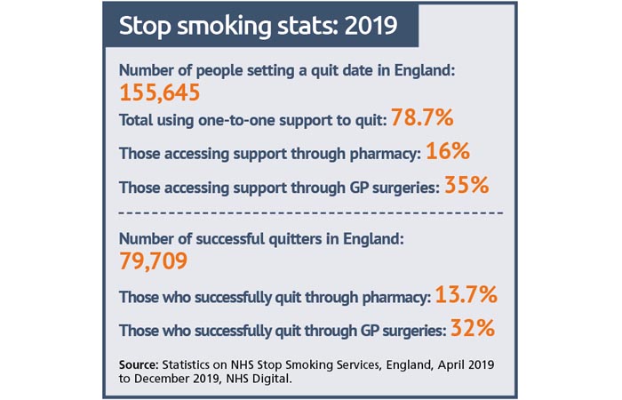 Research show that smokers are three times as likely to quit successfully if they use a combination of medication and specialist support from a local stop smoking service. According to NHS Digital, between April and December 2019, approximately 78.6 per cent of smokers in England who set a quit date used one-to-one support to help them quit smoking, with just over 16 per cent using stop smoking support through pharmacy. However, the uptake of stop smoking services has been declining overall in recent years.