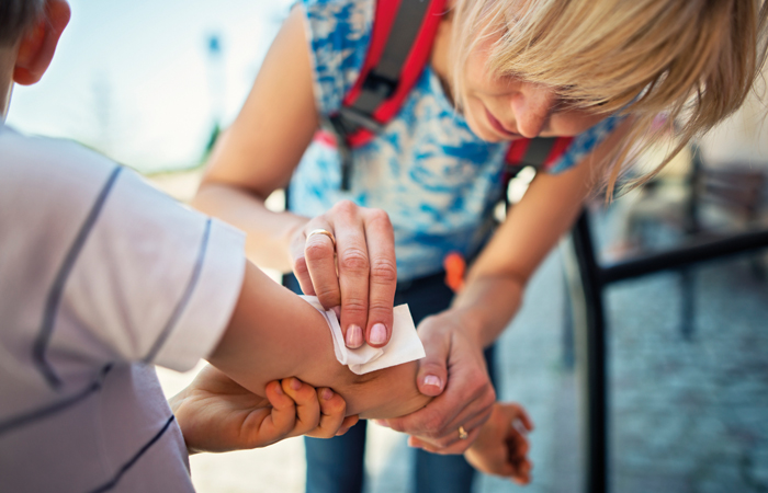 If the wound is bleeding, it should be raised above the level of the heart – for a hand or arm, hold the injury above the head, if it’s a lower limb then the person should lie down and raise the affected area. Once the bleeding has stopped, the wound should be cleaned, which not only helps prevent infection, but also encourages healing. According to the NHS, antiseptic should not be used as this can damage the skin and lead to scarring.